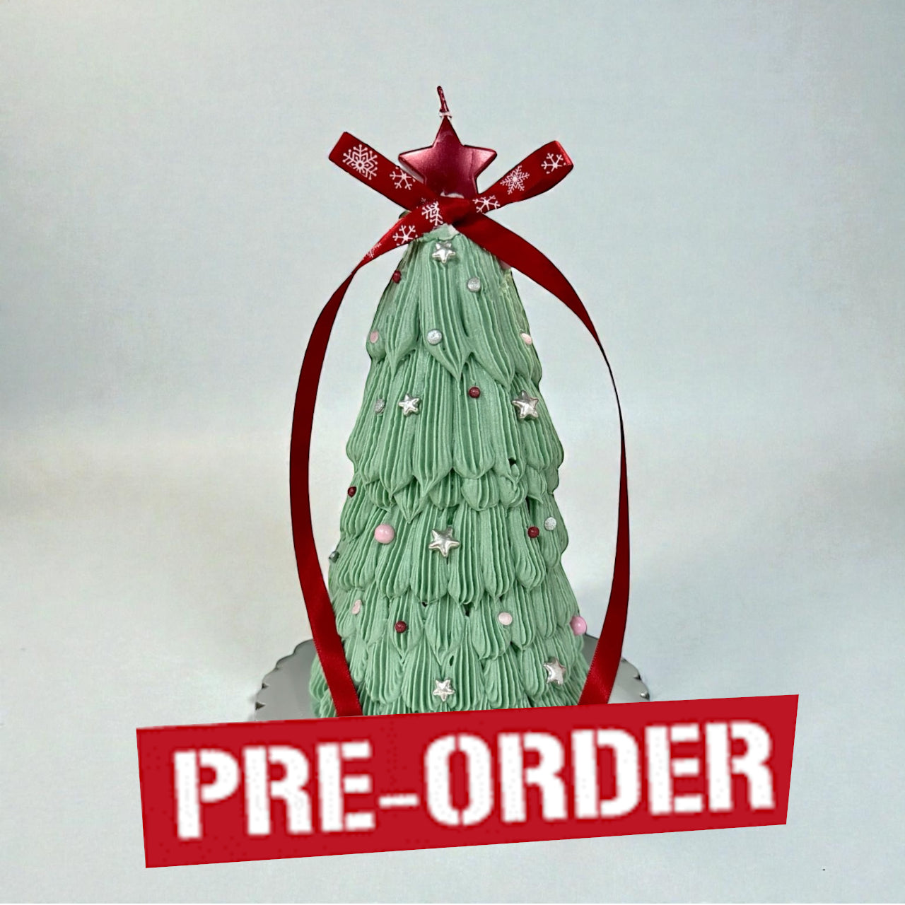 A festive holiday cake made with your choice of chocolate or confetti cake, filled with vanilla buttercream. Finished as a green or pink Christmas tree, and includes a star candle and fabric bow for the perfect holiday touch.