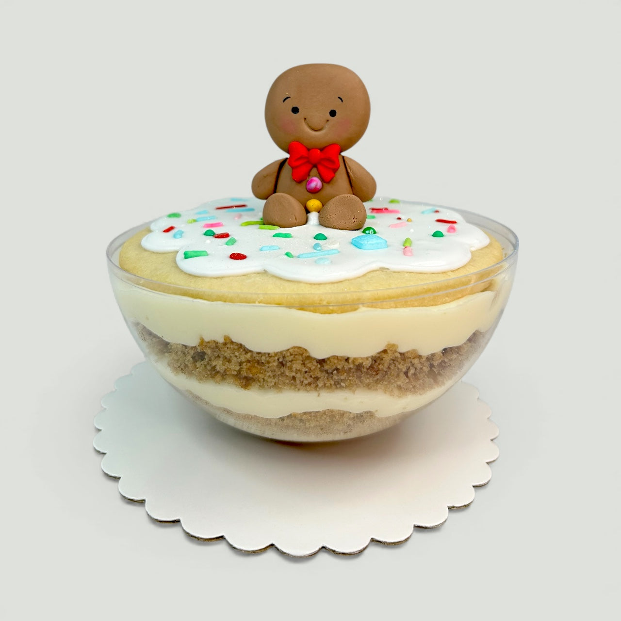 Inside is a layered cake crumble dessert, with your choice of red velvet, gingerbread, or chocolate peppermint, topped with a hand-decorated sugar cookie and a holiday fondant topper.